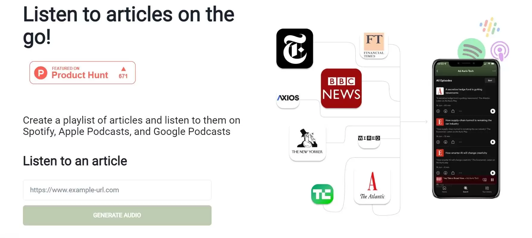 其核心卖点非常明确:让你“听”文章。你可以将各类文章添加进来,创建个性化的播放列表,然后直接在你熟悉的播客平台——比如Spotify、Apple Podcasts和Google Podcasts——上订阅并收听这些内容。这相当于为你打造了一个专属的、由AI生成的有声杂志频道。
