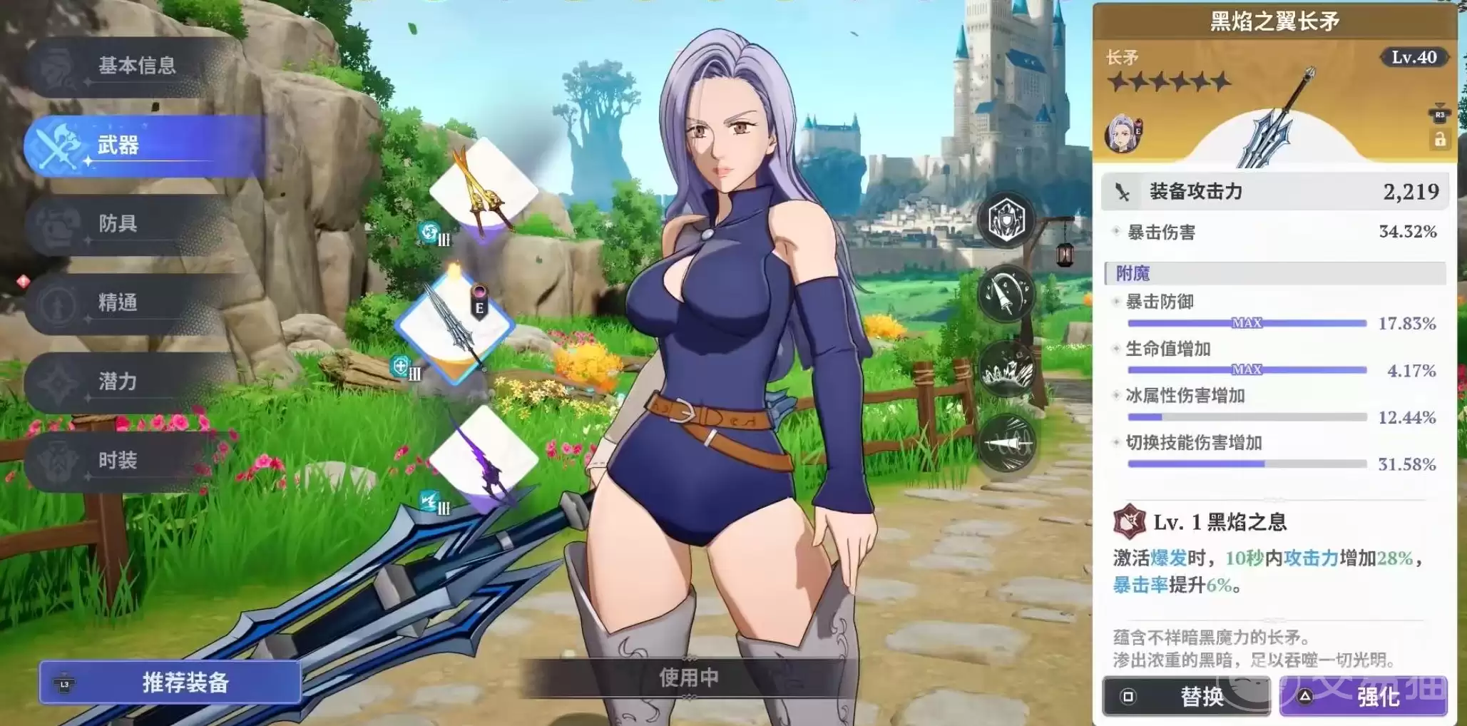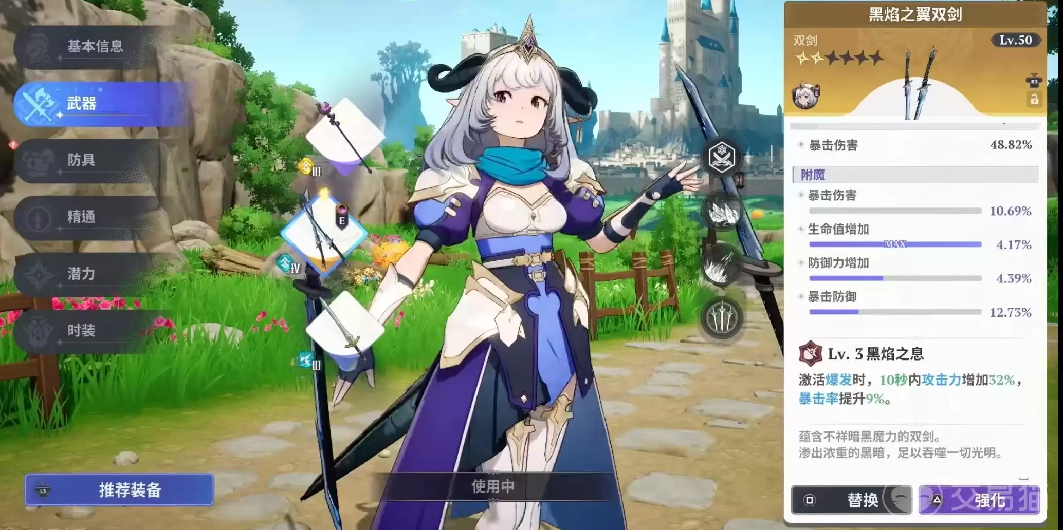 在《七大罪:起源》里,角色职能基本能划为四大块:扛起输出的主C、查漏补缺的副C、提供特定功能性的辅助,以及保住队伍的奶妈。而杰莉卡的妙处就在于,她并不固守一隅。根据不同配置,她完全可以在主C和辅助位之间灵活切换。这个变数的关键,就落在武器选择上。一个角色最多能带三把武器,杰莉卡的专属选项包括双剑、细剑和长枪——三者清一色冰属性,但各自的机制侧重却大不相同。