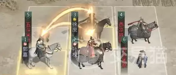 布阵上有几个关键细节必须注意:孙权绝对不能放在追击格位上,而徐庶和郭嘉,则必须部署在他的追击范围之内。只有这样,技能响应链才能完整传导,一环不断。