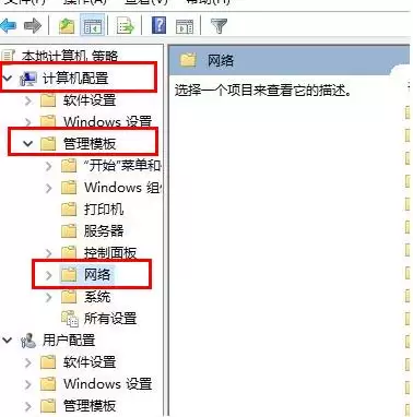第二步,在编辑器左侧的导航窗格中,依次展开并定位到:“计算机配置” -> “管理模板” -> “网络”。