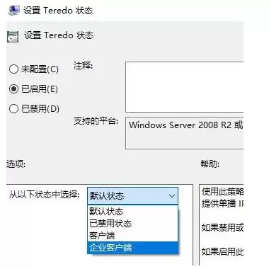 第五步,最后,双击打开 “设置Teredo状态”,选择 “已启用”,并将其下方的 “默认状态” 选项,修改为 “企业客户端”。