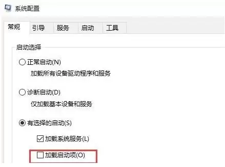 在“系统配置”的“常规”选项卡中,选择“有选择的启动”,并确保取消勾选“加载启动项”。