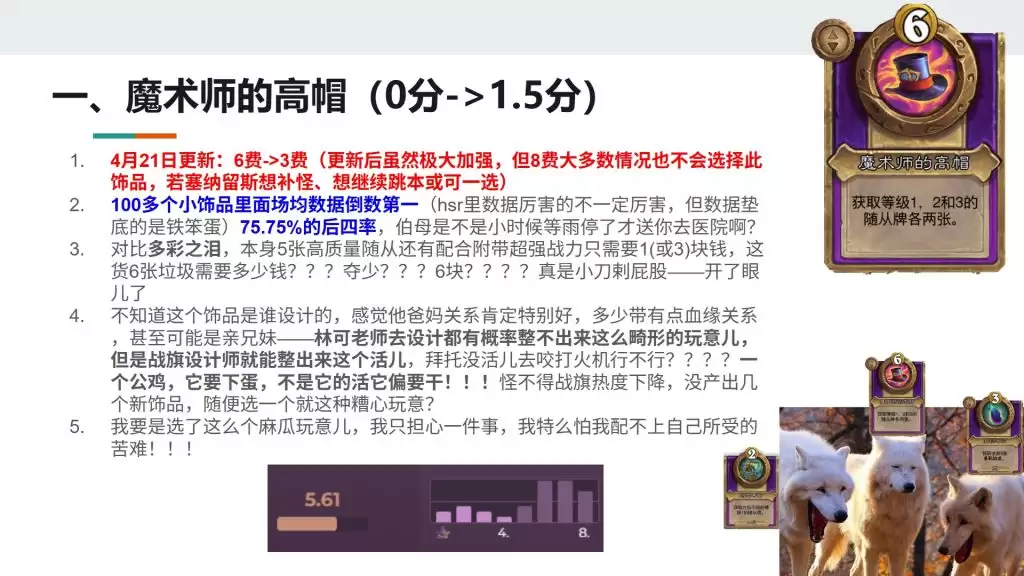 酒馆战棋S13小饰品魔术师的高帽强度一览 新赛季新气象,S13带来的小饰品“魔术师的高帽”一登场,就成了不少玩家讨论的焦点。这顶帽子到底是个花架子,还是真有扭转战局的实力?咱们今天就把它掰开揉碎了,好好分析一下。 从机制上看,这顶帽子的效果相当直接:在你使用一个战吼随从后,有一定概率发现一个低一星级