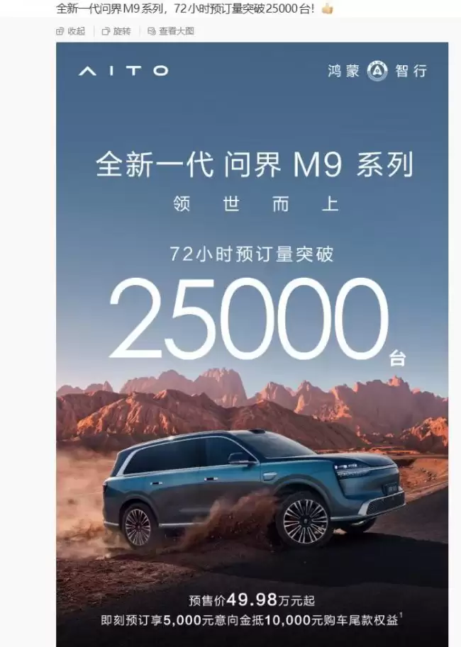 市场的反响似乎相当热烈。根据博主 @我鸿 分享的数据,全新一代问界M9系列在开启预订后的72小时内,订单量便突破了25000台。该系列车型的预售起售价为49.98万元。余承东此前曾强调,全新问界M9全车搭载了超过140项创新技术,其变革程度并非一次常规升级,而是一次彻底的重构,并表示后续还将有更多惊喜公布。