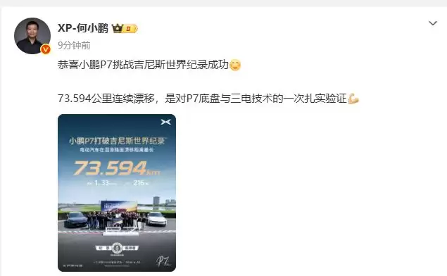 恭喜小鹏P7挑战吉尼斯世界纪录成功 4月27日,小鹏集团董事长何小鹏通过微博发布了一条消息,核心内容很明确:祝贺小鹏P7成功挑战了一项吉尼斯世界纪录。他在分享中特别指出,这次“73 594公里连续漂移”的壮举,本质上是对P7车型底盘与三电技术的一次扎实、有力的验证。