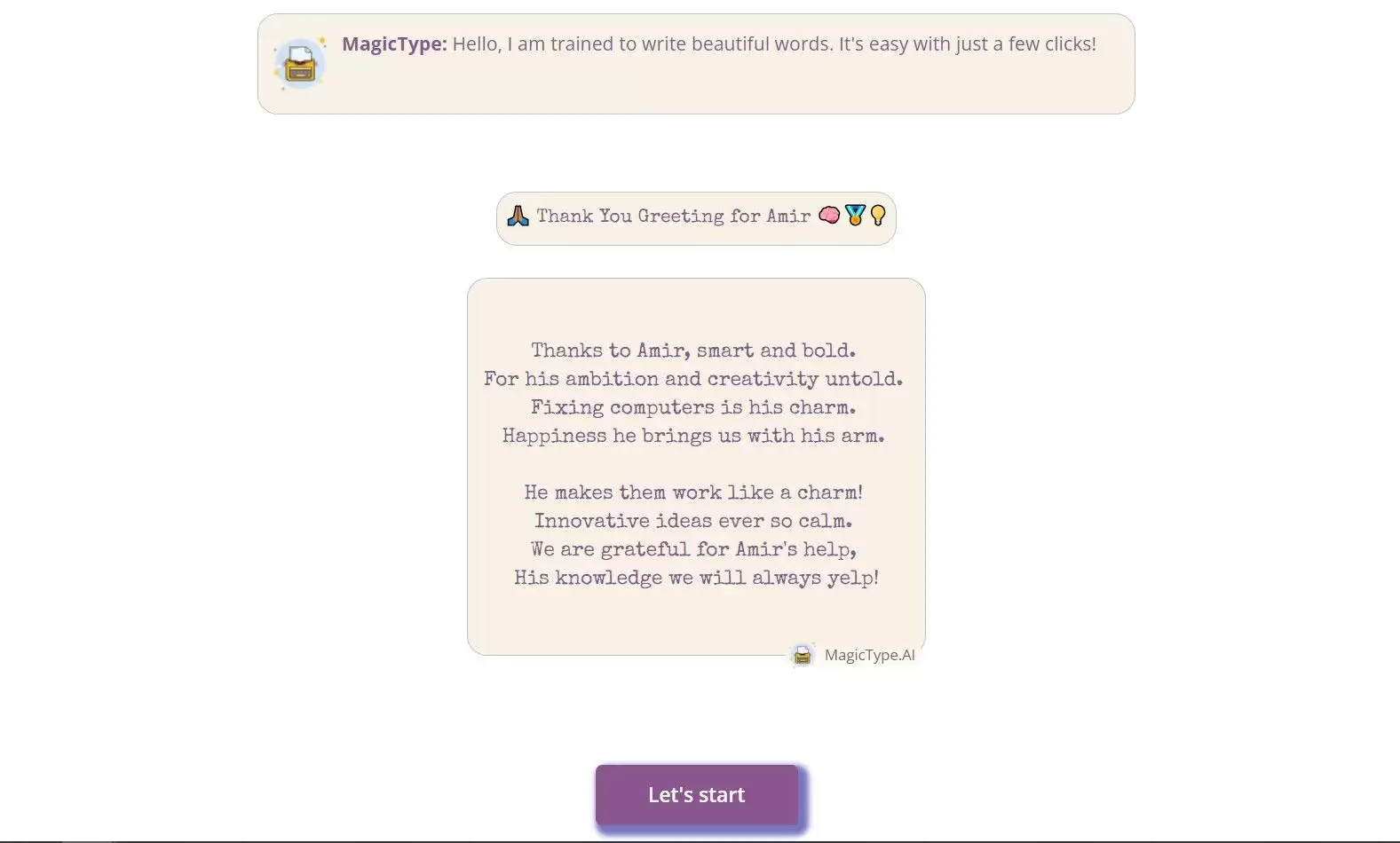 那么,它能做什么?从温馨的节日问候、抒情的诗歌,到节奏感十足的说唱歌词,Magic Type AI几乎都能应对。操作起来并不复杂:你只需要做一些简单的选择,它便能为你生成高度个性化的文字内容。这相当于拥有了一位随时待命的创意伙伴,专门为你量身打造各种文本。