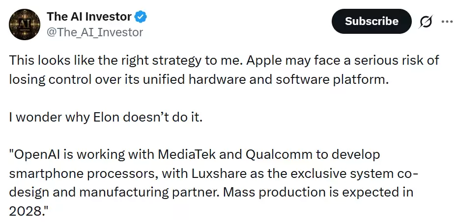 这一动向迅速引发了市场分析人士与资深投资者的广泛解读。知名科技投资博主@The_AI_Investor认为,OpenAI跨界硬件,是其实现AI能力闭环落地的关键一步。而苹果最引以为傲的护城河——其软硬件一体化生态系统——正在遭受最直接的挑战与威胁。