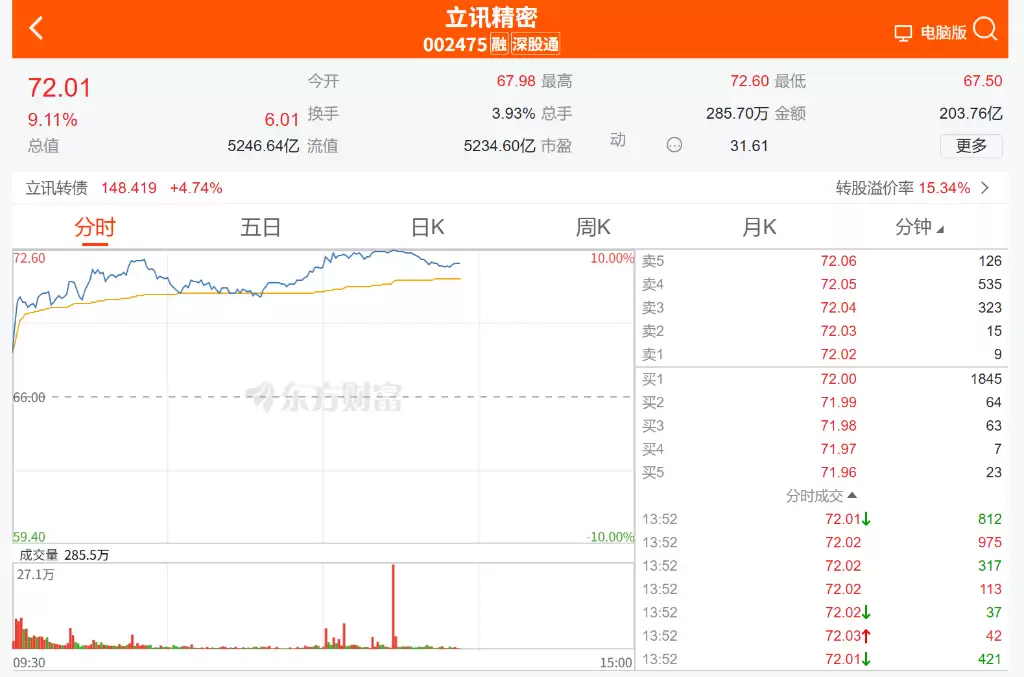 市场的反应最为直接。受此利好消息提振,周一立讯精密股价触及涨停,成交额高达170.11亿元。