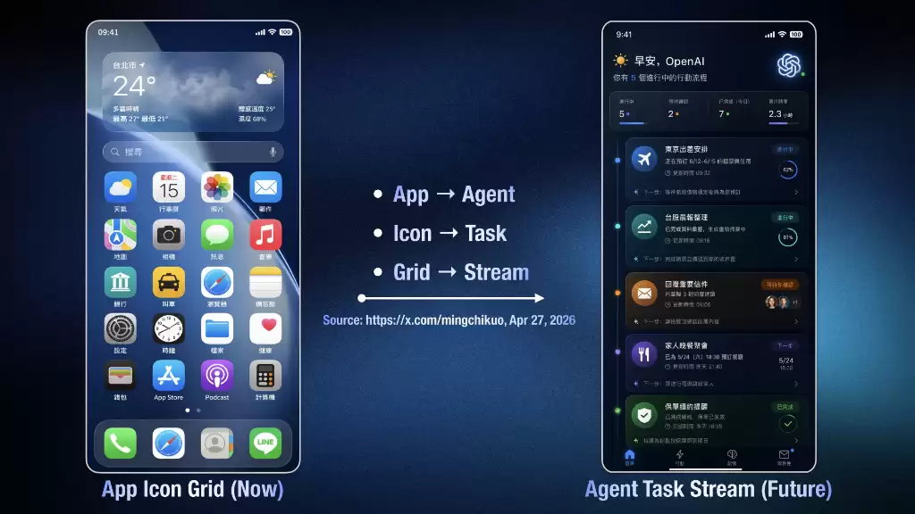 为了更直观地展示这场变革,郭明錤同时发布了一张AI agent手机界面概念图。其揭示的根本差异在于:用户不再需要在一堆应用程序中穿梭,而是直接向手机下达任务、满足需求。交互逻辑的碘伏,就此开始。