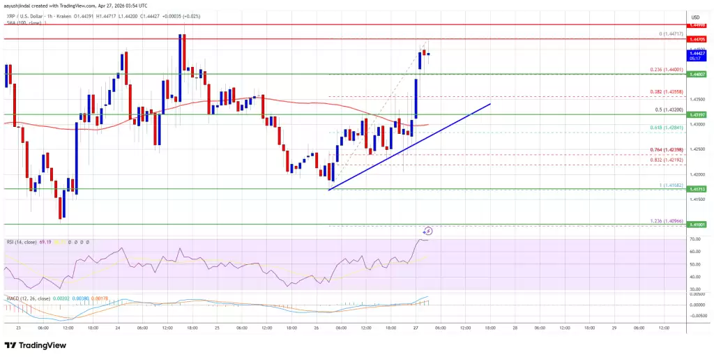 这轮上涨的起点,其实是从突破1.4250美元和1.4320美元开始的。当时,整个加密货币市场情绪被点燃,比特币和以太坊率先加速上涨,这种强势氛围无疑为XRP提供了助力。结果就是,XRP不仅突破了1.440美元的阻力,多头更是乘胜追击,将价格推高至1.4450美元区域,并一度触及1.4471美元的高点。