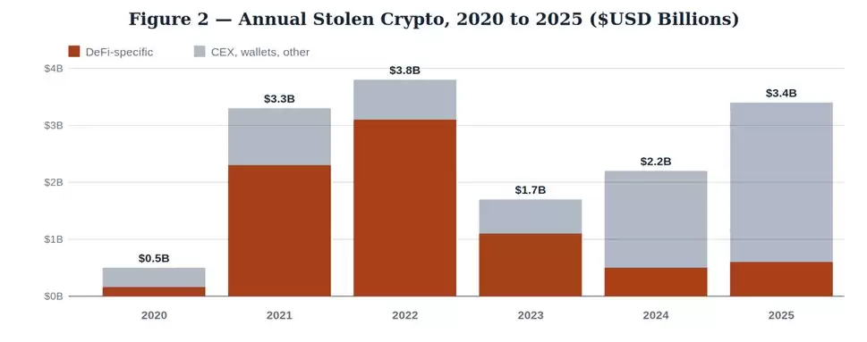 Chainalysis 2025 年 12 月中期报告,揭示了一组矛盾数据:2024 年初至 2025 年 10 月,DeFi 整体锁仓资产总值从 400 亿美元回升至 1750 亿美元阶段峰值,但 DeFi 专属黑客攻击亏损,维持在 2023 年低位区间。2025 年全年加密资产被盗总额 34 亿美元,风险高度集中于中心化交易所被盗与个人钱&包失窃。
