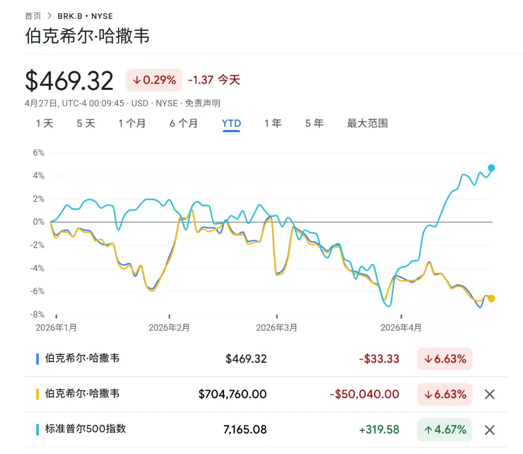 自2025年5月2日巴菲特在年度股东大会上宣布退休以来,伯克希尔A类股累计下跌约13%,同期标普500指数回报约26%,两者差距接近40个百分点。2026年以来,A类股进一步下跌约6%至706000美元,B类股同步走弱至470美元附近,而标普500年内涨幅约为4%。