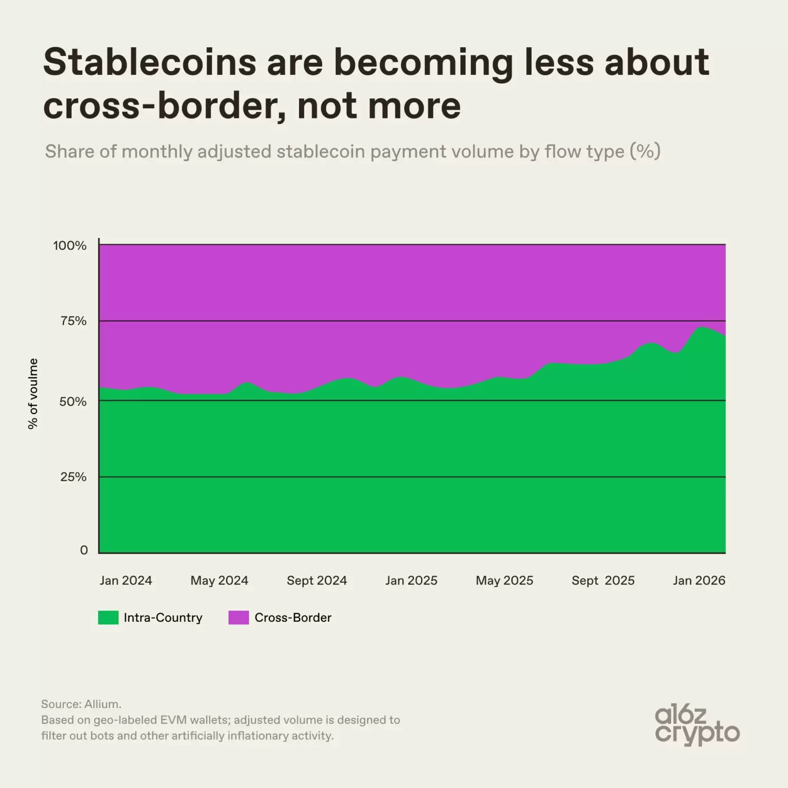 长期以来,稳定币被普遍定义为跨境工具,但跨境交易的实际占比正在持续下降。