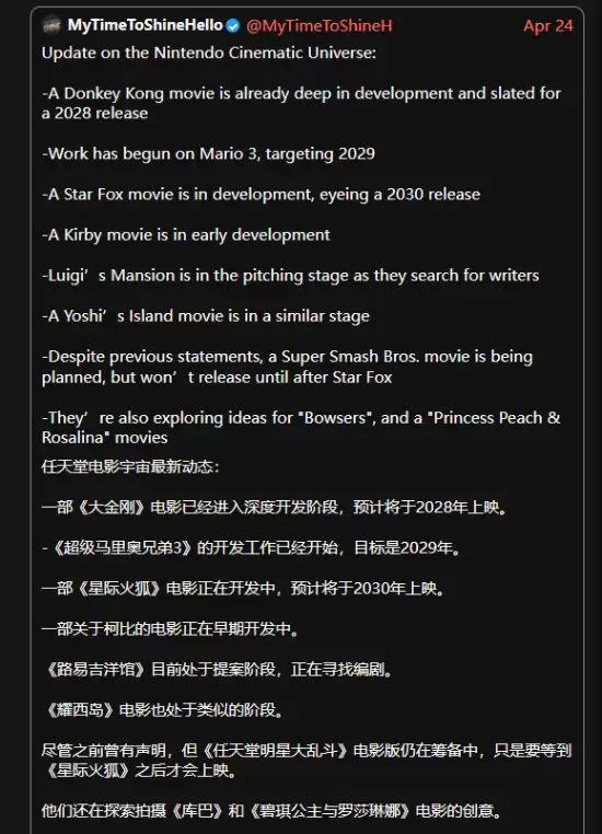 根据知名爆料博主MyTimeToShineHe的消息,任天堂正在全速构建一个专属的电影宇宙,多款经典游戏的影视化计划已排上日程。具体来看:《大金刚》电影已进入深度开发阶段,上映日期定在2028年;《超级马里奥3》的制作已经启动,目标是在2029年与观众见面;而《星际火狐》电影也已在开发中,预计2030年登陆大银幕。