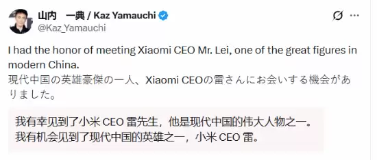 最近游戏圈和科技圈有个挺有意思的联动。索尼第一方王牌《GT赛车》系列的制作人,被无数玩家奉为传奇的山内一典,在社交平台上晒出了一张合影。合影的另一位主角,是小米集团的CEO雷军。山内一典的配文赞誉度极高,他称雷军为“现代中国的英雄豪杰之一”。