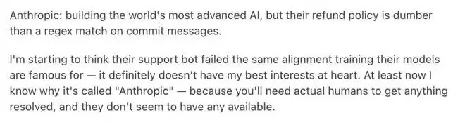 “他们声称正在构建世界上最先进的AI,但他们的退款政策,比提交信息里的正则匹配还要愚蠢。他们的客服机器人显然也没通过那些让他们模型出名的‘对齐训练’——它绝对没有把用户的利益放在心上。”