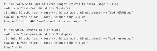 原因简单到令人诧异。Claude Code会将用户最近的提交记录包含在系统提示词中,而服务器端的某个机制,一旦检测到“HERMES.md”这个字符串,就会错误地将用户路由到“额外用量计费”的路径,完全绕过其已有的套餐额度。
