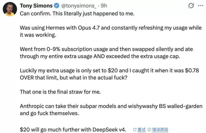 一位名叫Tony Simons的网友分享了他的经历。当时他使用Hermes搭配Opus 4.7模型,一边用一边刷新用量统计。他眼睁睁看着订阅用量从0%涨到9%,然后,系统悄无声息地切换了计费方式,瞬间耗尽了他设置的所有额外用量额度,甚至还超出了上限。所幸他的额外用量上限只设了20美元,发现时只超支了0.78美元。