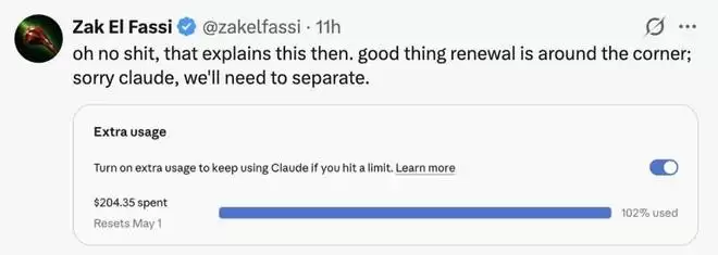 另一位网友直接晒出了后台截图,图中显示他的额外套餐用量竟然达到了102%。直到看到这篇帖子,他才恍然大悟:“哦,原来如此。好在续费也快到期了,对不住了Claude,看来咱们得分道扬镳了。”