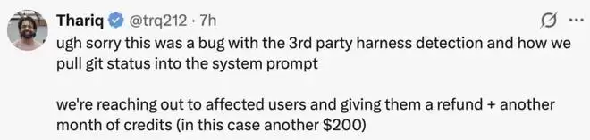 根据Thariq的描述,这次的问题再次归咎于“Bug”。他表示:“抱歉,这其实是第三方检测工具的一个Bug,问题出在我们把Git状态拉取到系统提示词的方式上。我们正在联系受影响的用户,并为他们提供退款,同时额外补偿一个月的积分(在此案例中为再补200美元)。”