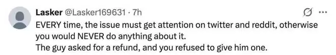 “每次都是这样,问题必须在Twitter和Reddit上引起关注,否则你们根本不会采取任何行动。之前那个用户要求退款,而你们拒绝退给他。”