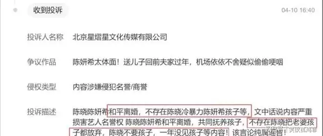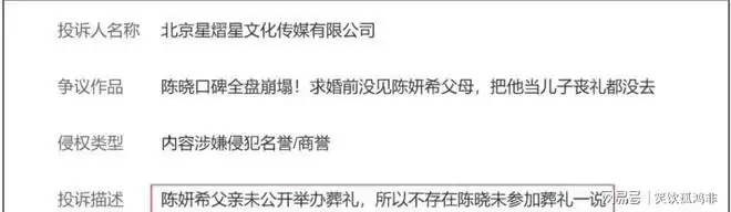 当年看来,这或许只是好友间的调侃;如今回看,却像是对其性格底色一次精准的预言。陈晓的“轴”与“自我”,在离婚后的风波中展现得淋漓尽致。当陈妍希起诉大粉的事件引发广泛关注后,陈晓方面终于有所“回应”。在相关投诉的备注理由中,其团队如此解释葬礼缺席一事:“陈妍希父亲并未公开举办葬礼,因此不存在未参加一说。”