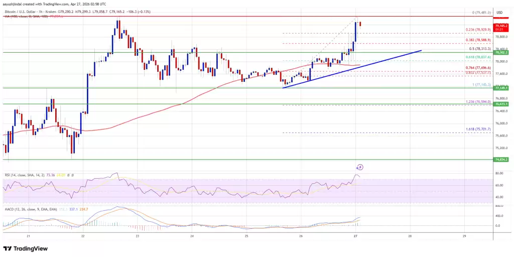 比特币价格在 77,000 美元附近获得支撑后,便重拾升势。这波上涨不仅突破了 77,500 美元和 78,000 美元两道阻力,势头还相当强劲。多头甚至一鼓作气,将价格推高至 78,500 美元以上,并在 79,480 美元处形成了一个短期高点。