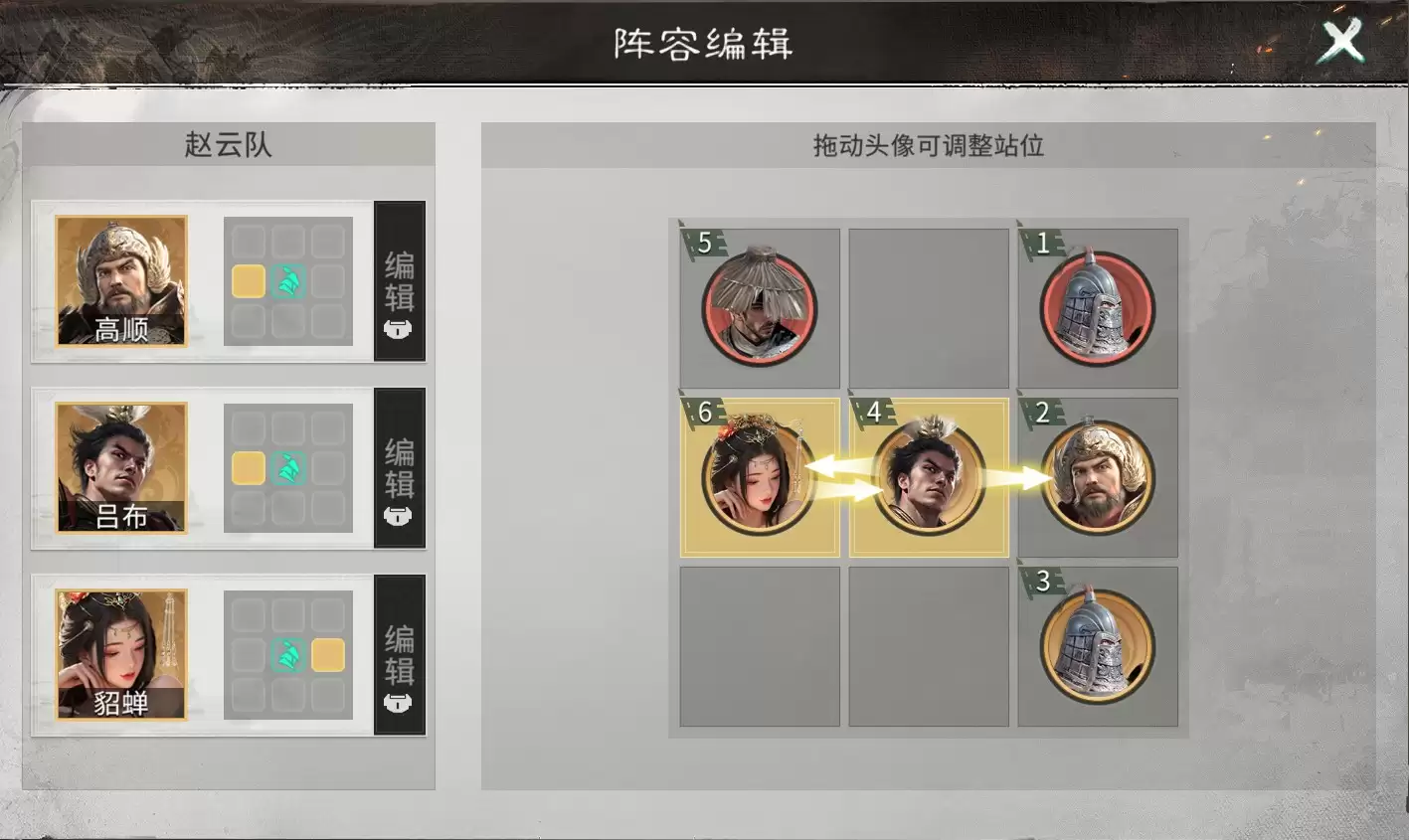 英雄站位:这里有个关键细节:高顺不要站在追击格上。让吕布去站高顺的追击格,同时,吕布和貂蝉互相站在对方的追击格上。这么一站,联动效果就出来了。