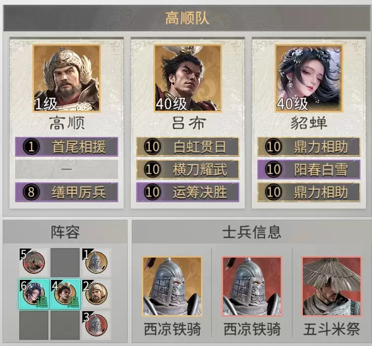 兵种站位:在貂蝉上方放一个【五斗米祭】,给队伍提供续航;在高顺的上方和下方,则各布置一个【西凉铁骑】,强化前排的扛伤和反击能力。