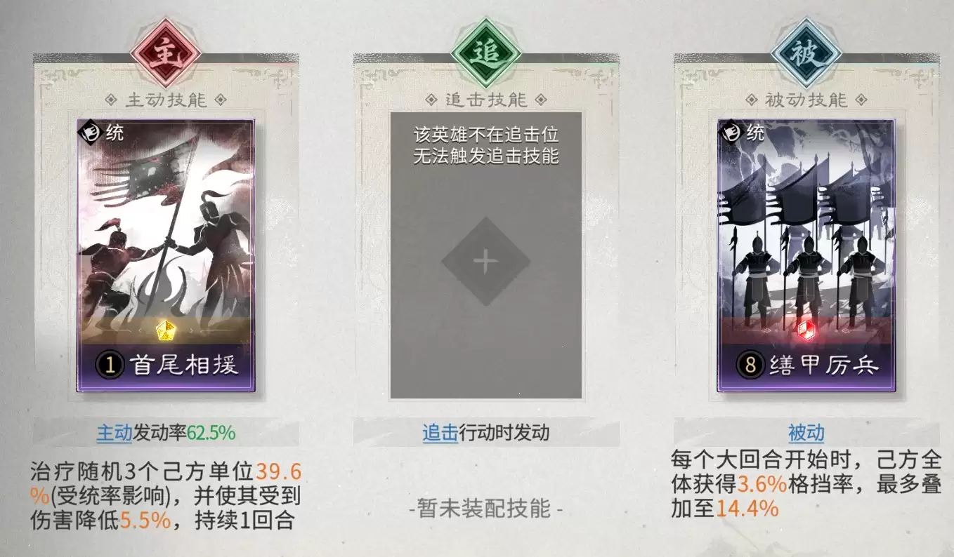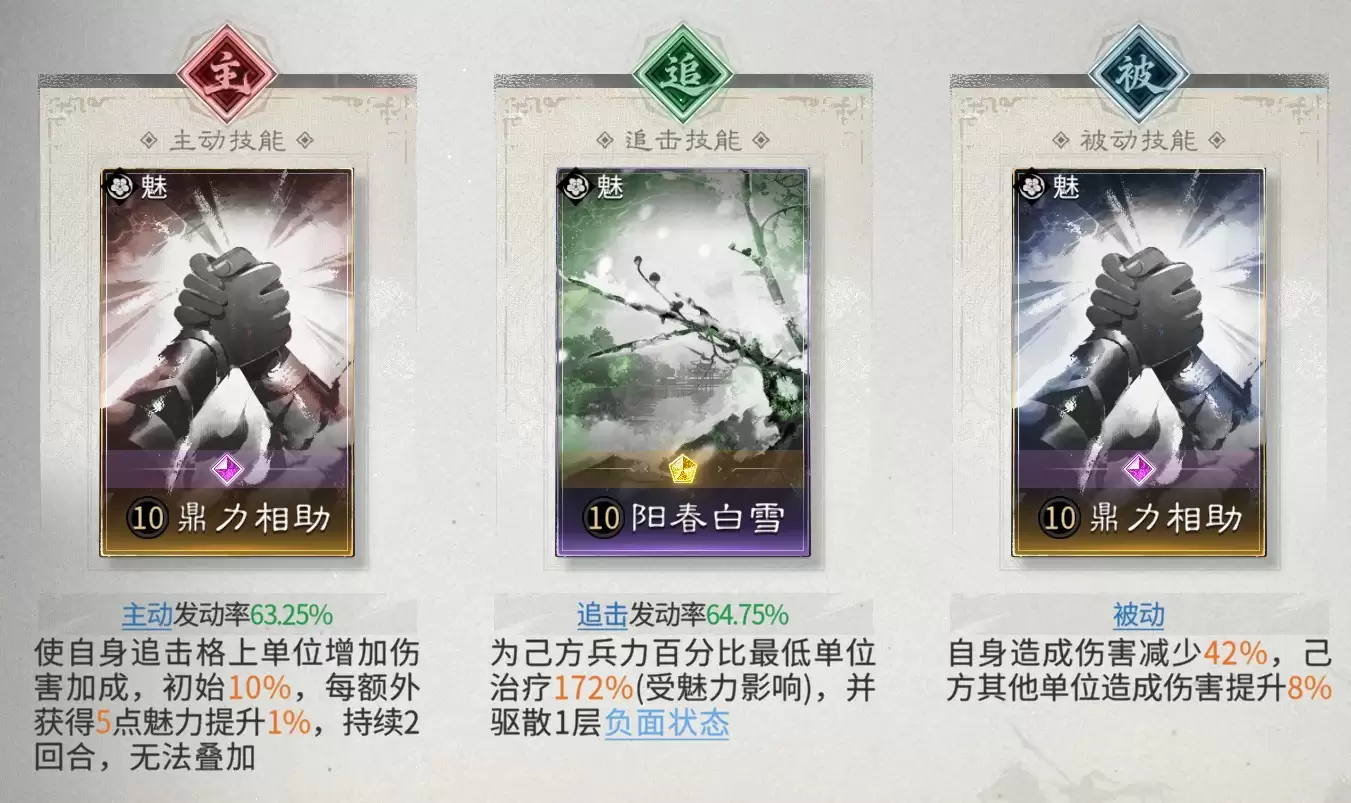 追击技能固定带【阳春白雪】。这个技能可以治疗兵力百分比最低的单位,并驱散一层负面状态,是队伍重要的续航和净化手段。
