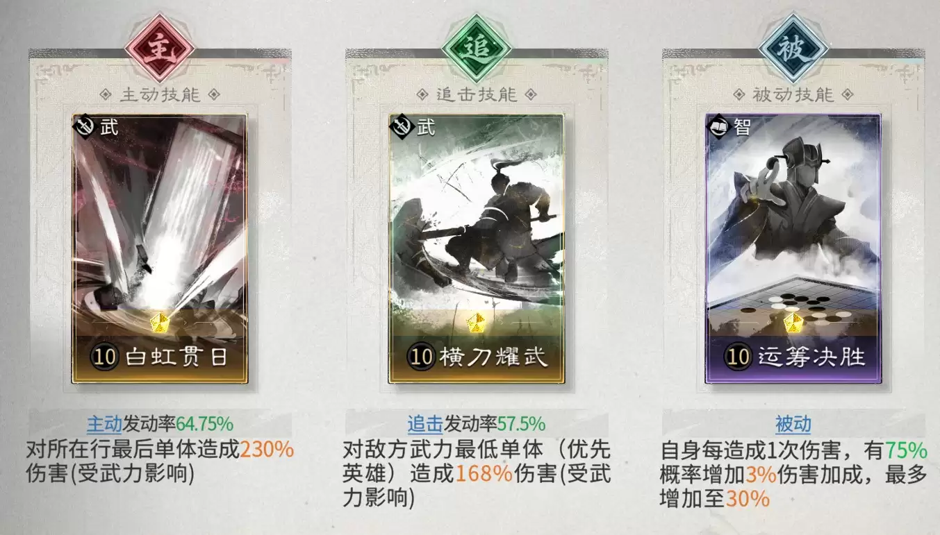 主动技能推荐【白虹贯日】,专门打击所在行的最后一个单位,用来针对后排核心非常有效。