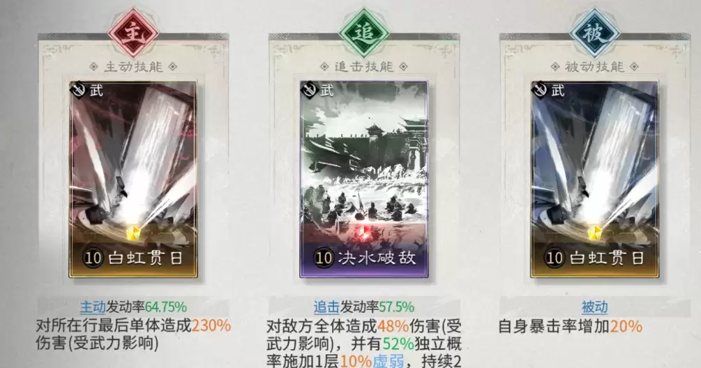 主动技能推荐【白虹贯日】,同样是针对同行最后排的单体高伤技能。追击技能带【决水破敌】效果很好,能对敌方全体造成武力伤害,并有概率附加【虚弱】状态。被动技能则携带【白虹贯日】(同名技能),用于提升自身的暴击率,让追击伤害更加致命。