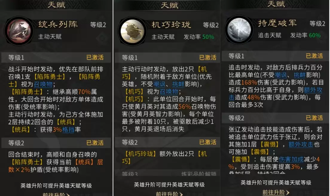高顺的天赋【统兵列阵】,开局就能召唤一支继承他70%属性的【陷阵勇士】。当他主动发动技能时,还能给全体队友加上【统兵】效果,提升全队的格挡率,生存能力直接拉高。