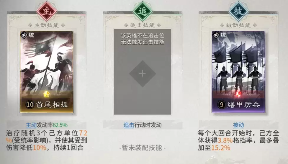 主动技能推荐带【首尾相援】,能随机治疗三个己方单位并降低他们受到的伤害,进一步巩固阵容的续航。被动技能则固定携带【缮甲厉兵】,每个大回合开始时全体获得格挡率叠加,让队伍越来越“硬”。