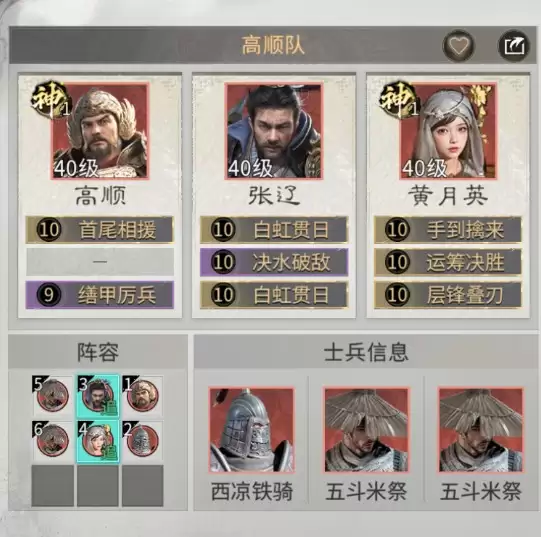 兵种站位:在张辽和黄月英的后方,各放置一名五斗米祭;在高顺的下方,则放置一名西凉铁骑。这个布阵能很好地兼顾输出环境与前排承伤。