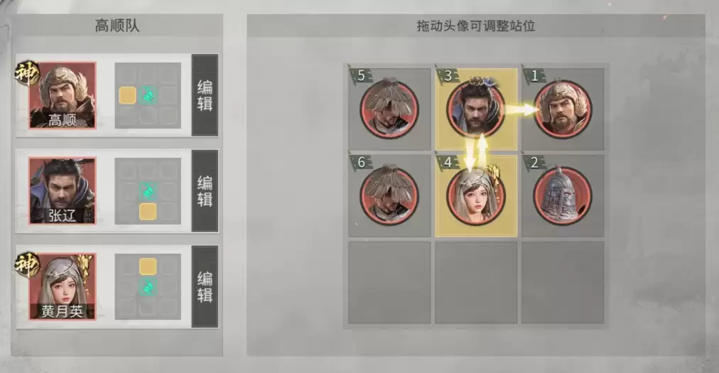 英雄站位:这里有个关键细节:高顺不要站在追击格上。而是让张辽去站高顺的追击格,同时,张辽和黄月英彼此互站对方的追击格,这样能最大化触发追击联动。