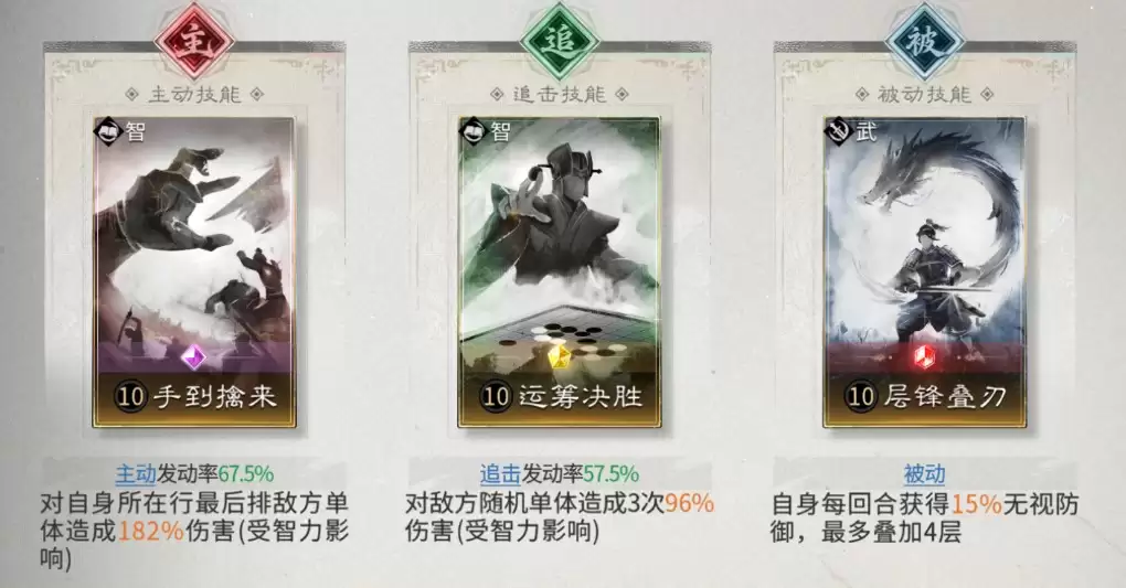 主动技能固定带【手到擒来】,能对同行最后排的敌人造成高额智力伤害,定点打击能力很强。追击技能推荐【运筹决胜】,可以对随机敌方单体进行多次智力打击。被动技能带【层锋叠刃】是个不错的选择,每回合积累无视防御,最高4层,伤害穿透力会随时间显著增强。
