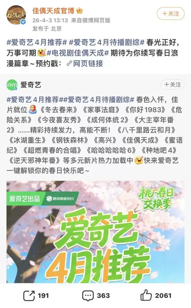值得一提的是,该剧由爱奇艺、欢瑞世纪出品,早期宣传口径一直是爱奇艺独播。尽管目前已出现在腾讯视频的4月片单中,但在剧集官方微博的最新宣传物料里,仍未增设腾讯视频的预约入口与联动信息。