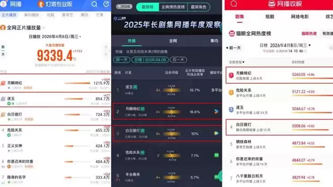 另一边,《白日提灯》虽然也获得了云合S+评级,但截至发稿,其最高市占率仅为10.8%。不仅如此,在猫眼剧集全网热度榜与灯塔剧集全网正片播放量榜上,它也连续被《月鳞绮纪》压制。