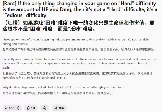 “如果游戏‘困难’难度下唯一的变化只是生命值和伤害值翻倍,那这根本不是‘困难’难度,而是‘乏味’难度。”最近,Reddit论坛上的一条吐槽帖可谓一石激起千层浪,精准戳中了无数玩家的痛点。帖子直指当前游戏行业一种心照不宣的“偷懒”行为:简单粗暴地调高敌人数值,然后贴上“硬核挑战”的标签敷衍了事。