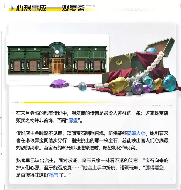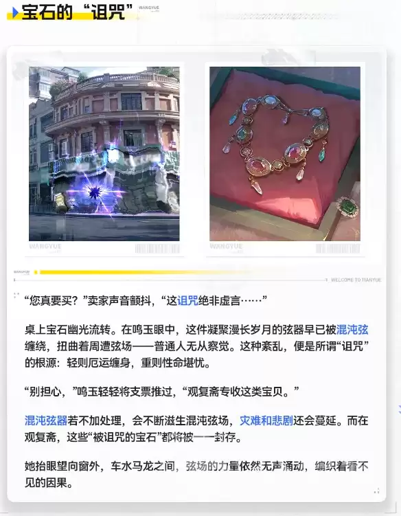 那么,“观复斋”具体是做什么的?这里恰恰体现了鸣玉能力的精髓。这处天悦城的人文坐标,日常运营便依赖于她的核心能力:感知来访者内心最真实的愿望与情绪波动,并将其具象化为带有祝福效力的珠宝信物。这个过程,融合了心愿解析、情感凝练与物质转化三重机制,难怪在民间会被传颂为“许愿成真之术”。当然,她的职责不止于此。净化能力构成了其职业能力的另一轨道——面对那些被污染或遭受诅咒侵蚀的宝石类遗物,鸣玉能够实施定向能量净化,有效阻断负面能量的扩散路径。这套组合拳下来,她实际上守护的是整座都市看不见的安全边界。