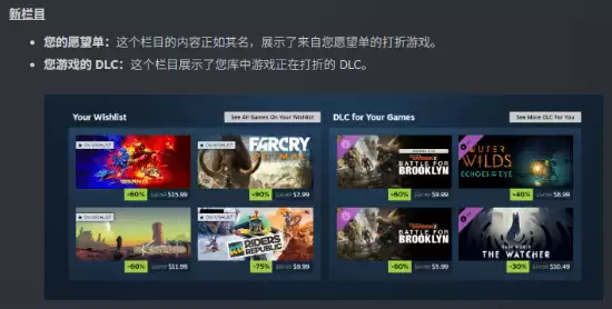 除了整体的界面焕新,这次Beta更新还悄悄塞进了两个实用的新栏目,值得多加留意,分别是“折扣愿望单”和“折扣DLC”。