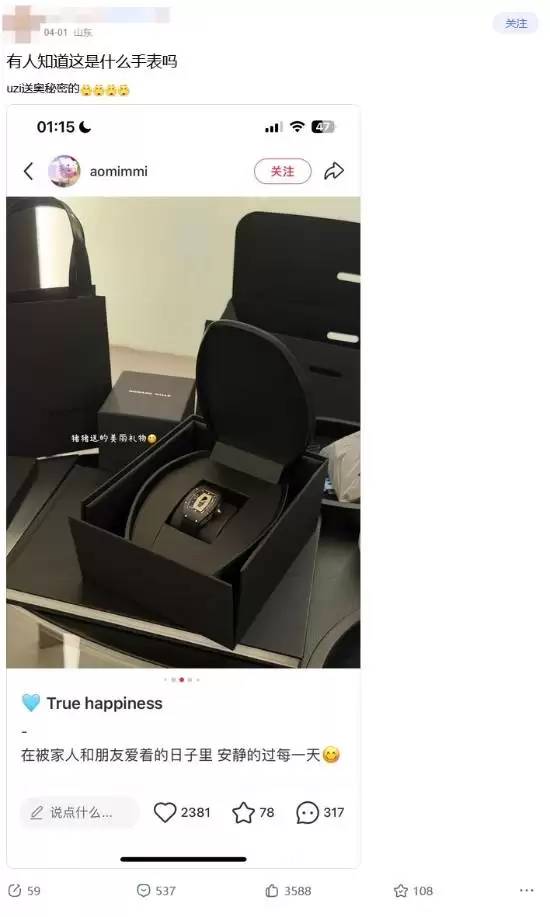 宠妻还是常态?从一块价值350万的名表,看Uzi的“顶流”生活 最近电竞圈有个话题热度不低,有眼尖的贴吧网友发现,前《英雄联盟》明星选手Uzi,给妻子“奥咪咪”送了一份重磅礼物——一块疑似价值高达350万元的理查德·米勒手表。消息一出,立刻成了大伙儿茶余饭后的谈资。 果不其然,相关讨论很快发酵。看看