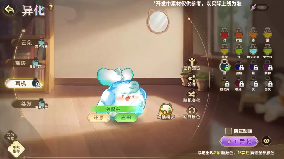 异化系统开放后,每一只可异化的精灵都将拥有4个可供定制的部位。以精灵·盐朵朵为例,它的云朵、盐块、头饰以及头发都能进行异化调整。当然,不同精灵的身体结构各异,可异化的具体部位也会有所区别。