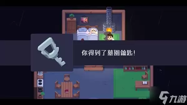 进村后往右边探索,能看到一间有光亮的房子。进去和里面的NPC对话,他会给你一把关键的「墓园钥匙」。