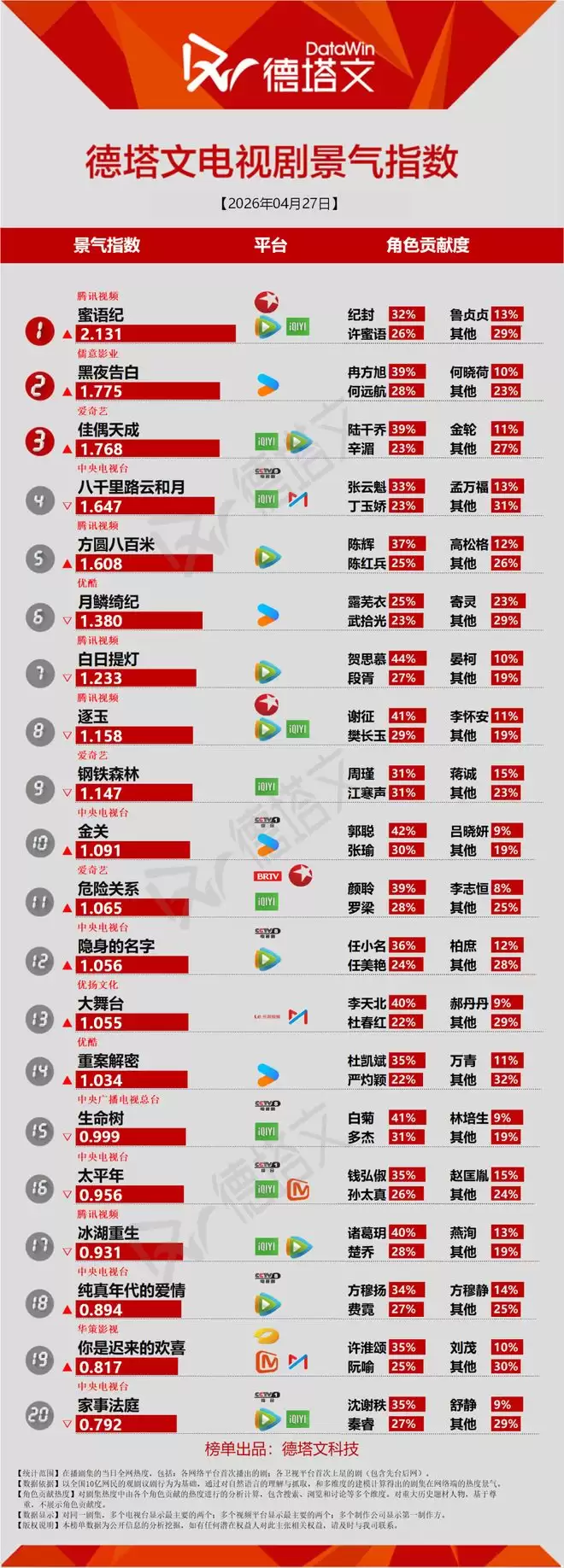 蜜语纪(纪封32% 许蜜语26%) 黑夜告白(冉方旭39% 何远航28%) 佳偶天成(陆千乔39% 辛湄23%) 八千里路云和月 方圆八百米 月鳞绮纪 白日提灯 逐玉 钢铁森林 金关 危险关系 隐身的名字 大舞台 重案解密 生命树 太平年 冰湖重生 纯真年代的爱情 你是迟来的欢喜 家事法庭