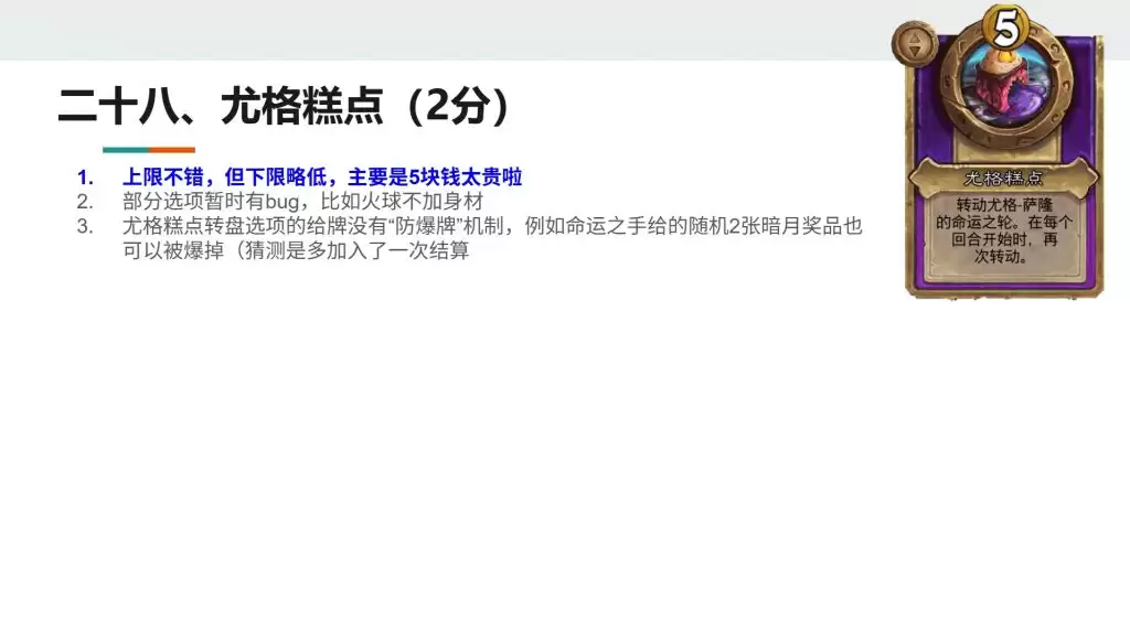 首先,是它的灵活性。它不绑定任何特定种族或流派,任何需要短时间内提升单个随从战斗力的阵容,都可以考虑塞一张进去。尤其是在你拿到一个优质胚子(比如带有圣盾或风怒的关键随从)却苦于身材成长太慢时,尤格糕点能提供一种“速成”方案。