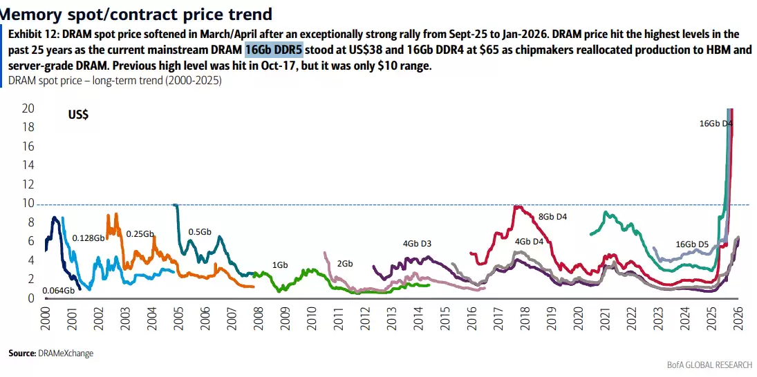 根据DRAMeXchange的数据,16Gb DDR5的现货价大约在38.5美元,而16Gb DDR4的现货价则高达63.9美元,两者都处于过去25年来的最高水平。合同价方面,DRAM合同价在2026年4月创下历史新高,达到35至40美元的区间;16Gb DDR5的合同价预计4月份环比涨幅超过20%,而在此前的第四季度和第一季度,已经分别暴涨了约200%和80%。