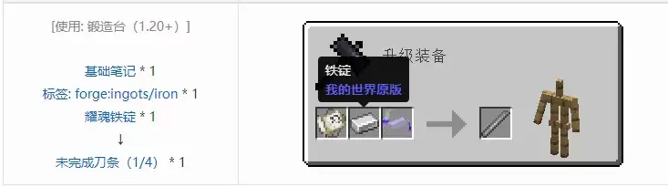 我的世界最后的太刀匠人合成表大全 咱们先从最基础、也最关键的一步讲起:未完成刀条。这是所有太刀锻造的起点,通常被标记为(1 4),意味着整个锻造流程才刚刚拉开序幕。 那么,这个核心的初始部件究竟如何获得呢?它的合成配方,可以说是整个工艺体系的基石。 合成表: