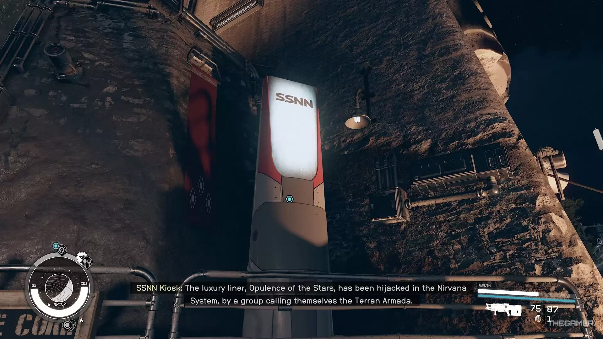 准备就绪后,动身前往阿基拉城或新亚特兰蒂斯城。你的目标是找到SSNN广播终端——在阿基拉城,它就在岩石区(The Rock)的左侧;而在新亚特兰蒂斯城,商业区那家熟悉的咖啡店附近就能看到它。